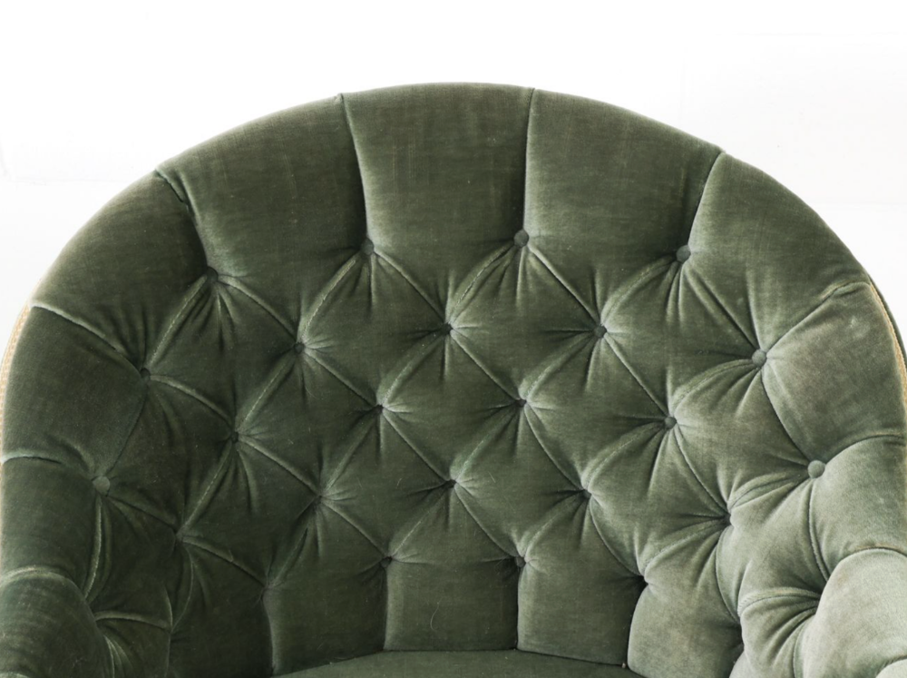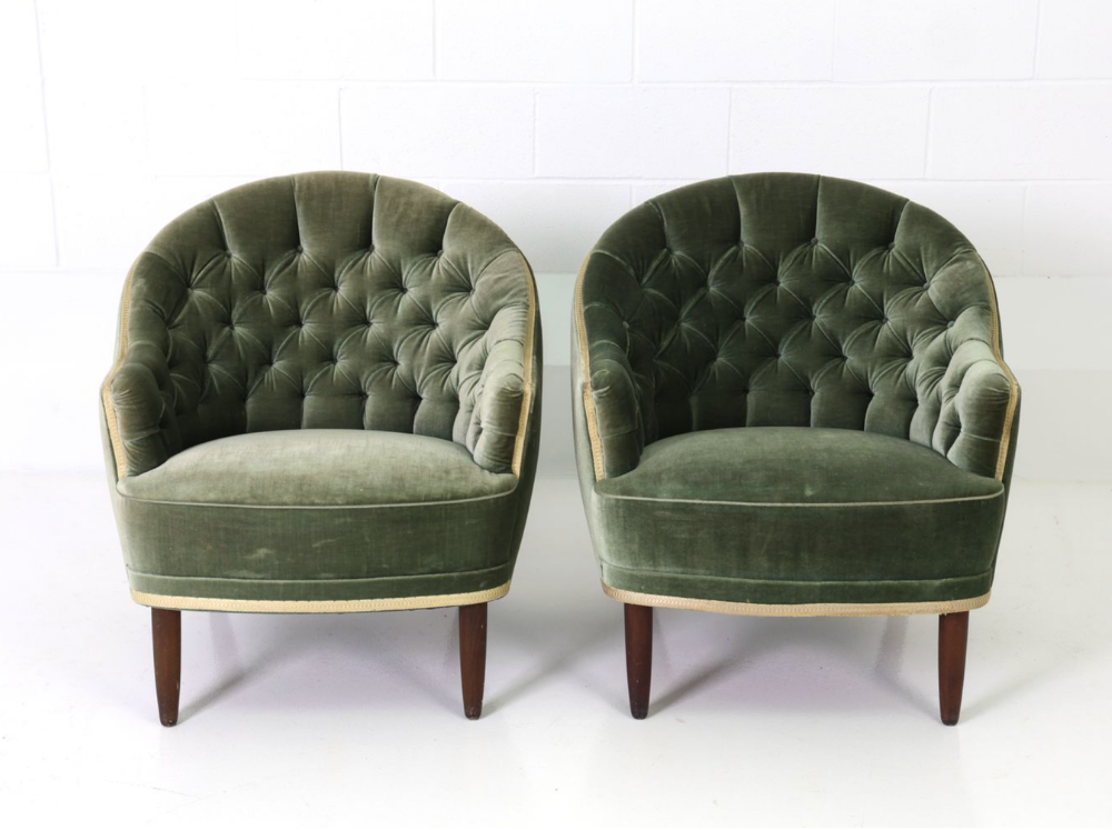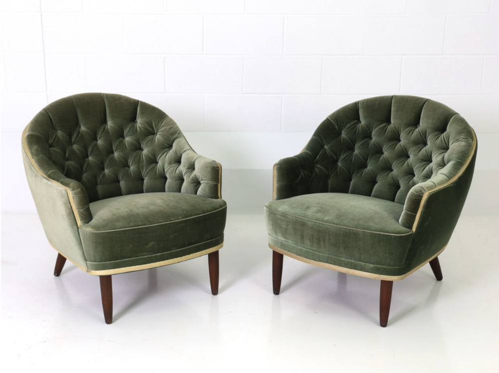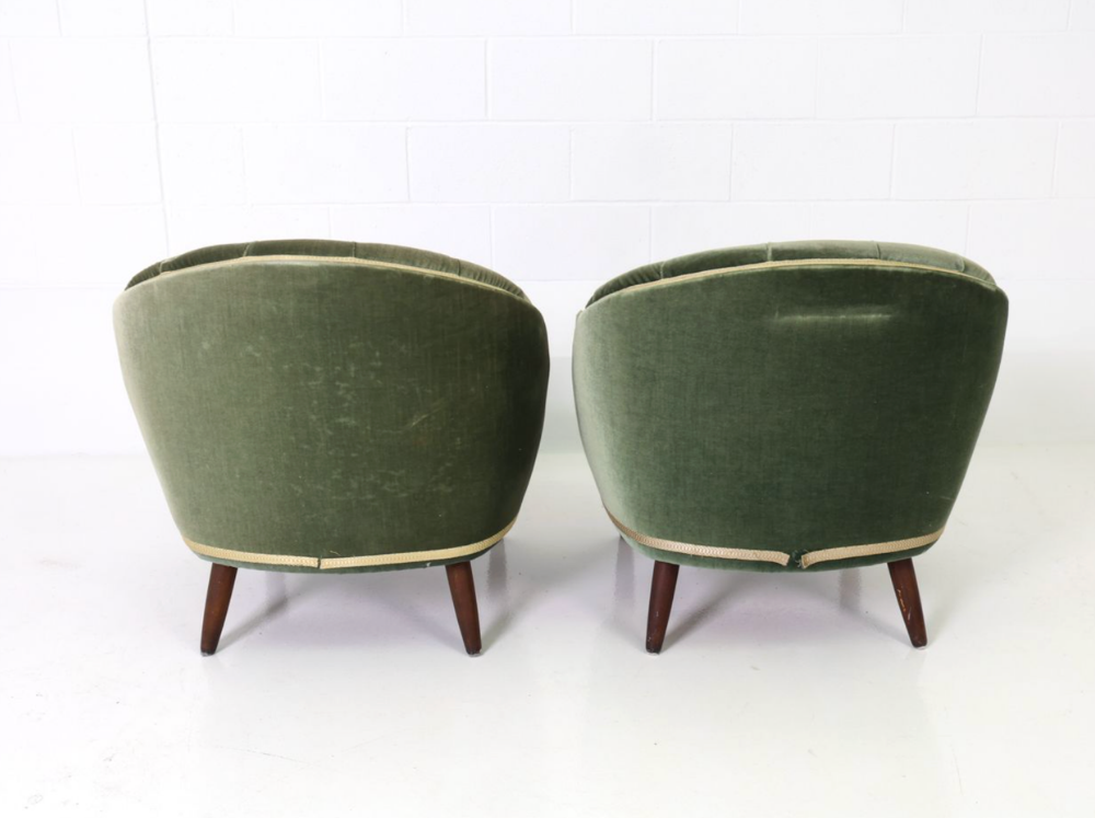 Pair of 1940s Danish barrel back lounge chairs in tufted sage velvet with wooden legs. Perfection.