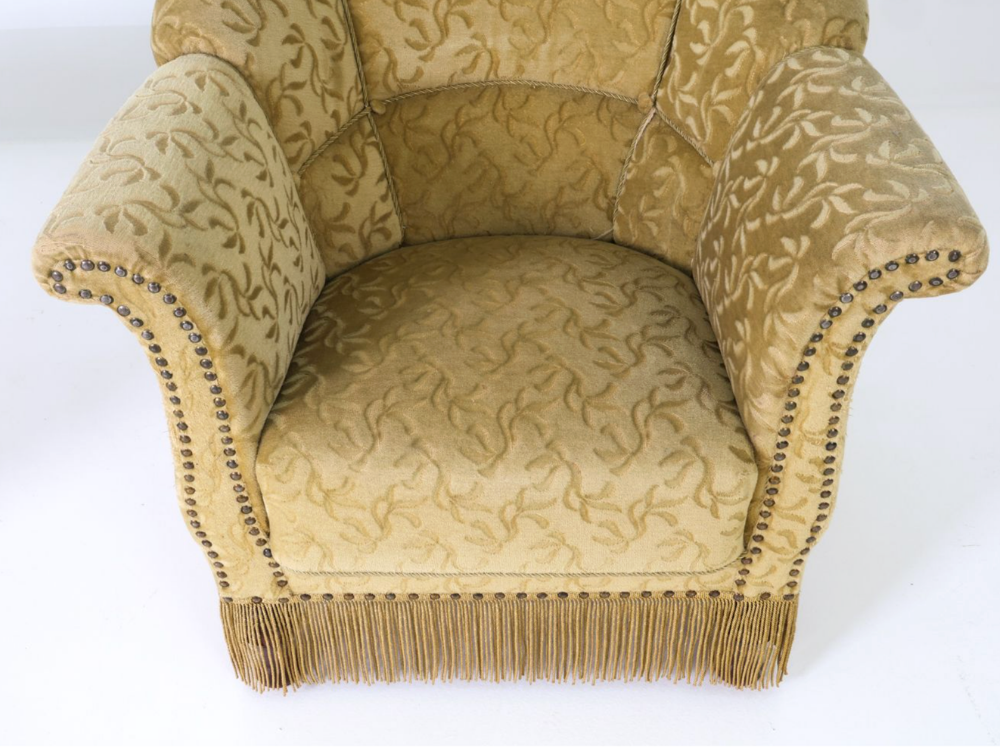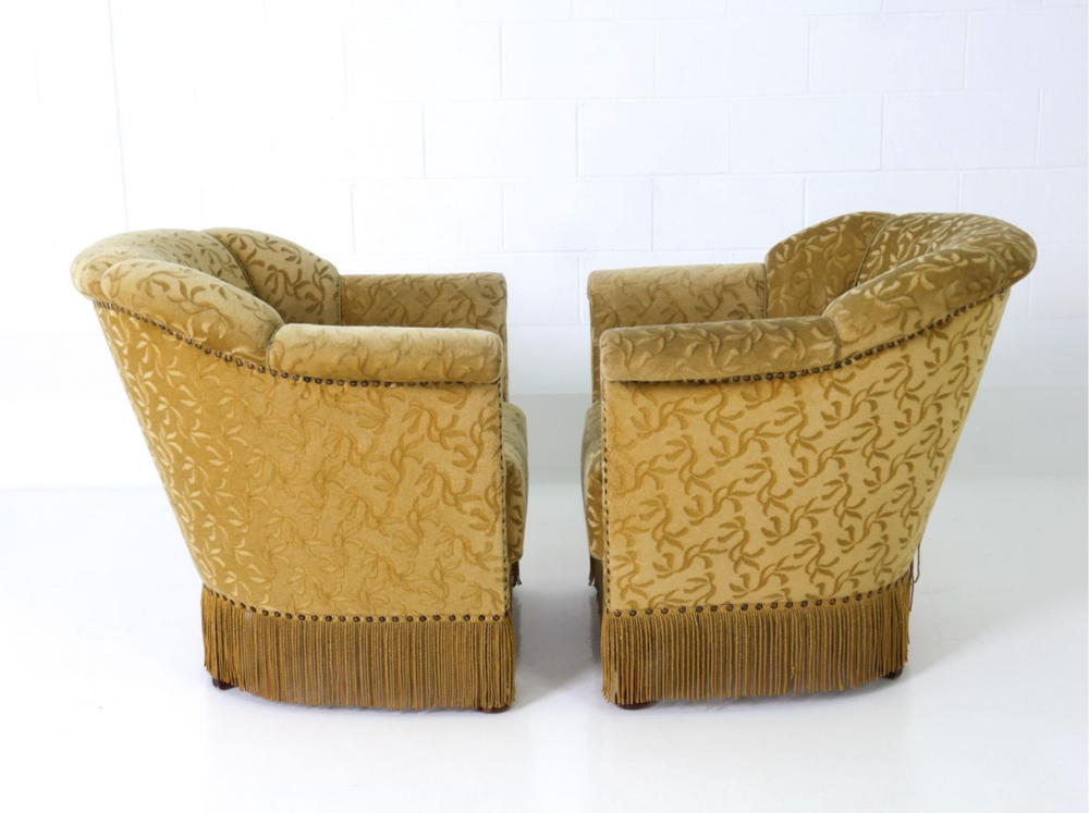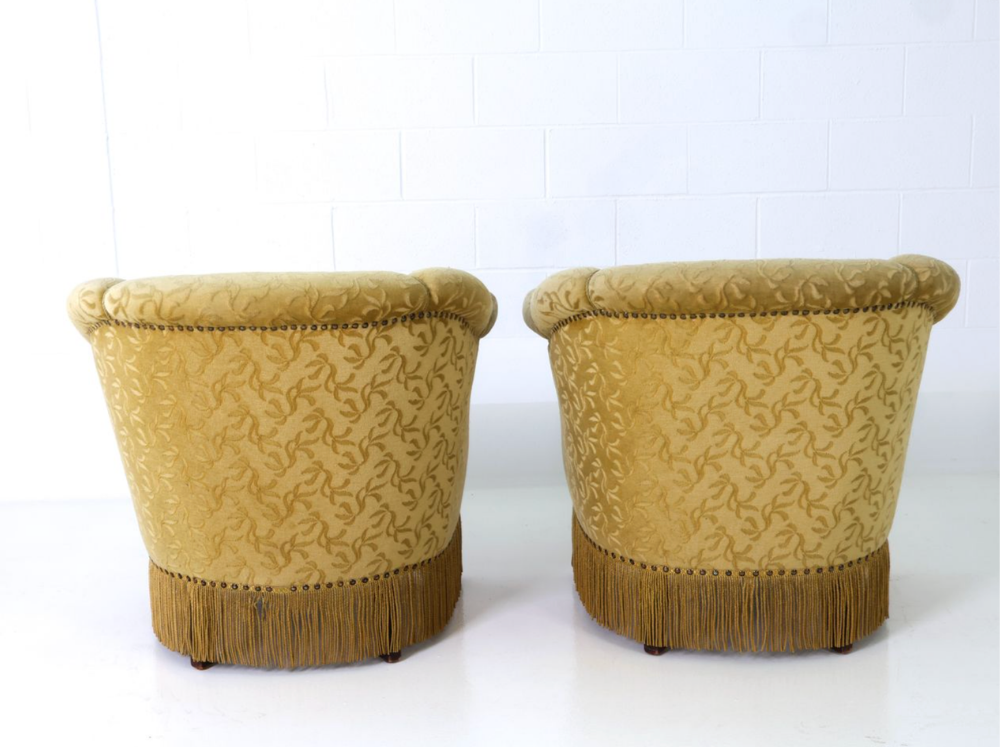 Sweet pair of tulip armchairs with original golden botanical upholstery, corded fringe skirt, and brass nailhead trim.