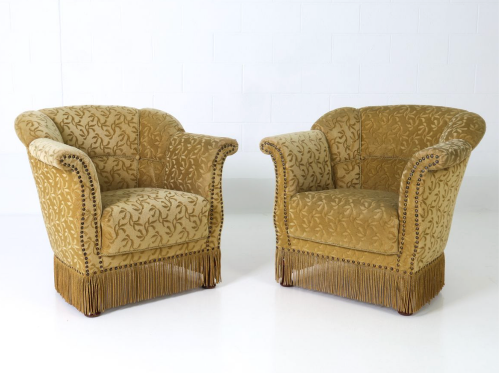 Tags: bullion fringe, danish, floral print, original upholstery, storied vintage, set of 2