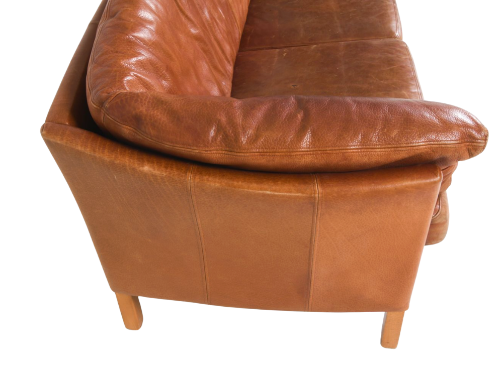 Brown leather sofa by Mogens Hansen with the perfect patina. This Danish beauty is from the 1970s, with a gently arched, rounded back, clean lines, and original leather upholstery.