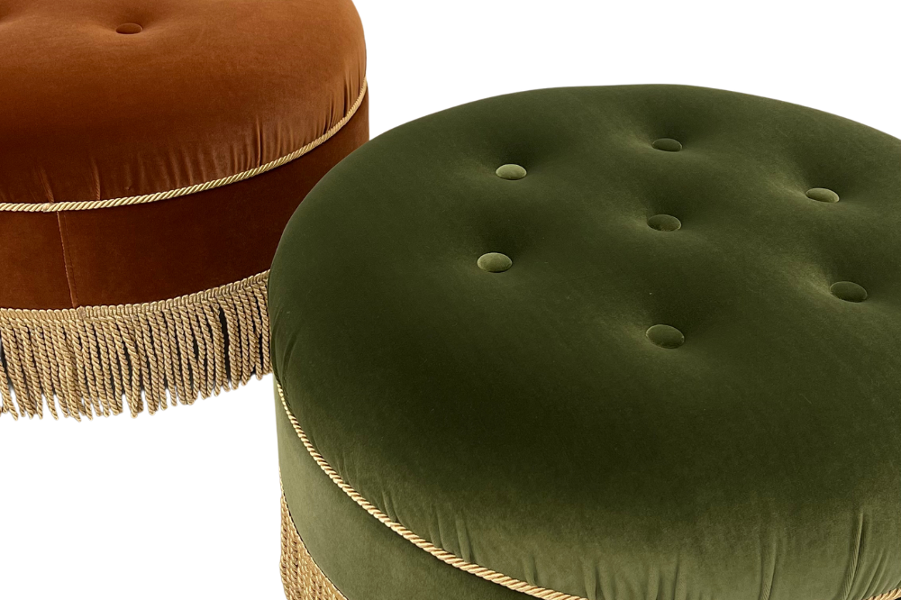 Tufted ottoman in a lush sienna velvet wrapped in luxe fringe.