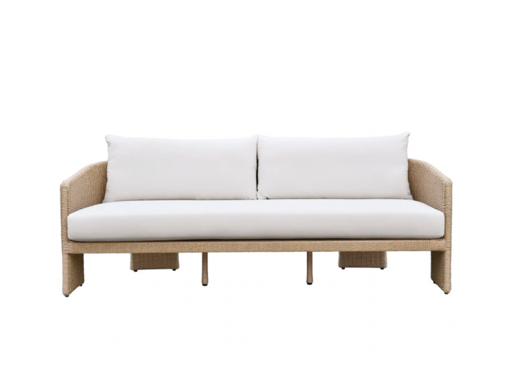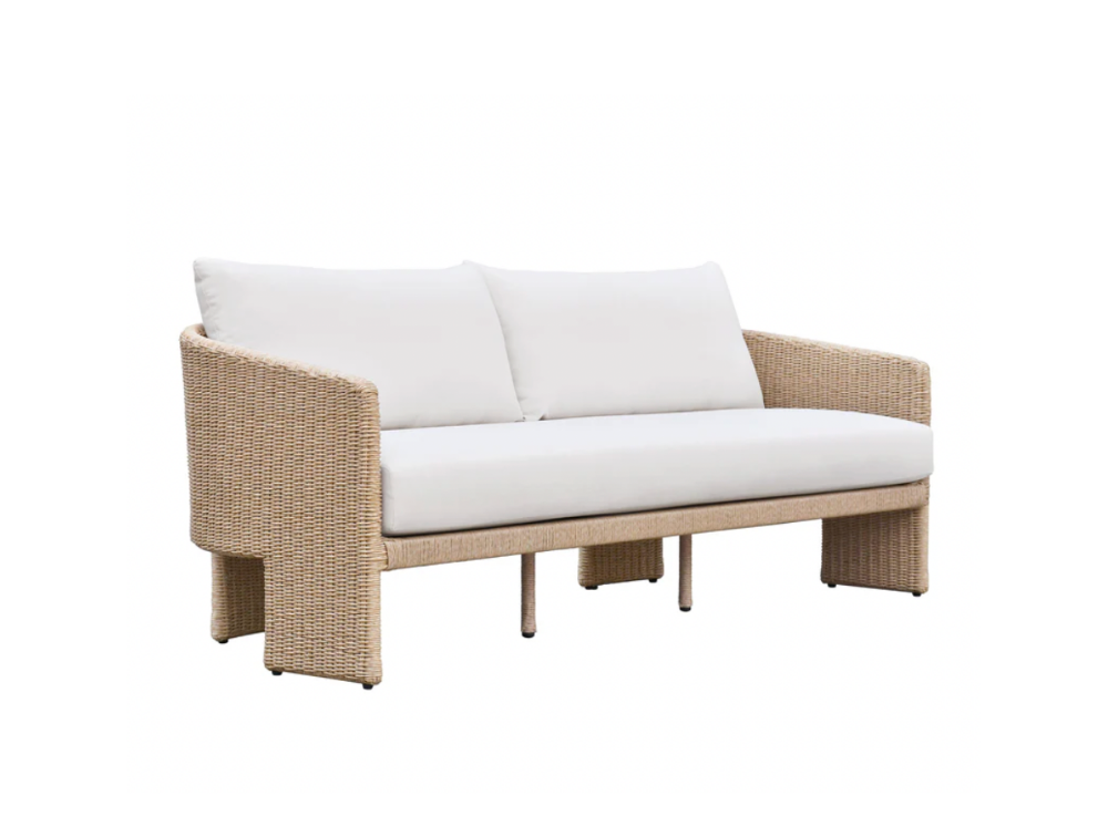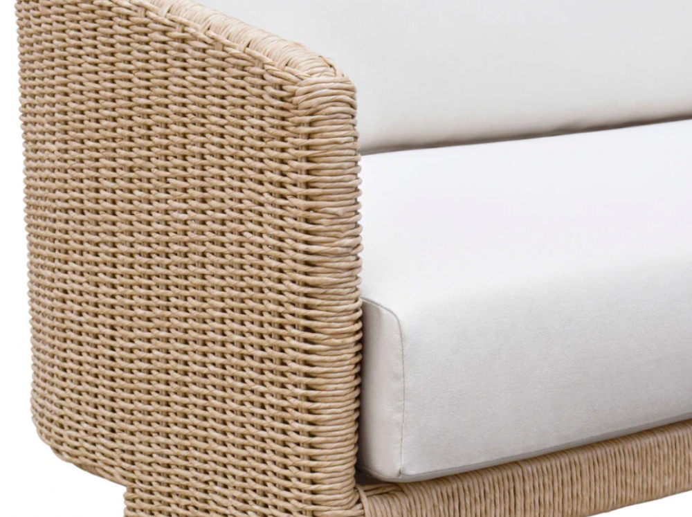 Sculptural outdoor rattan sofa with cream cushions.