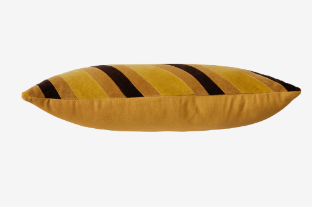Spirited lumbar pillow with bold mustard, caramel, and black velvet stripes.