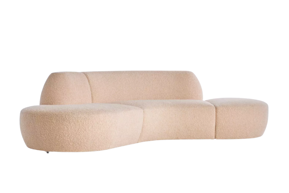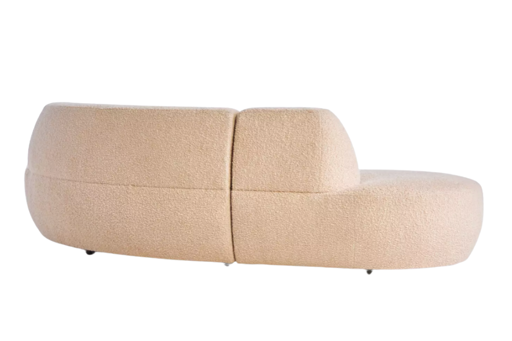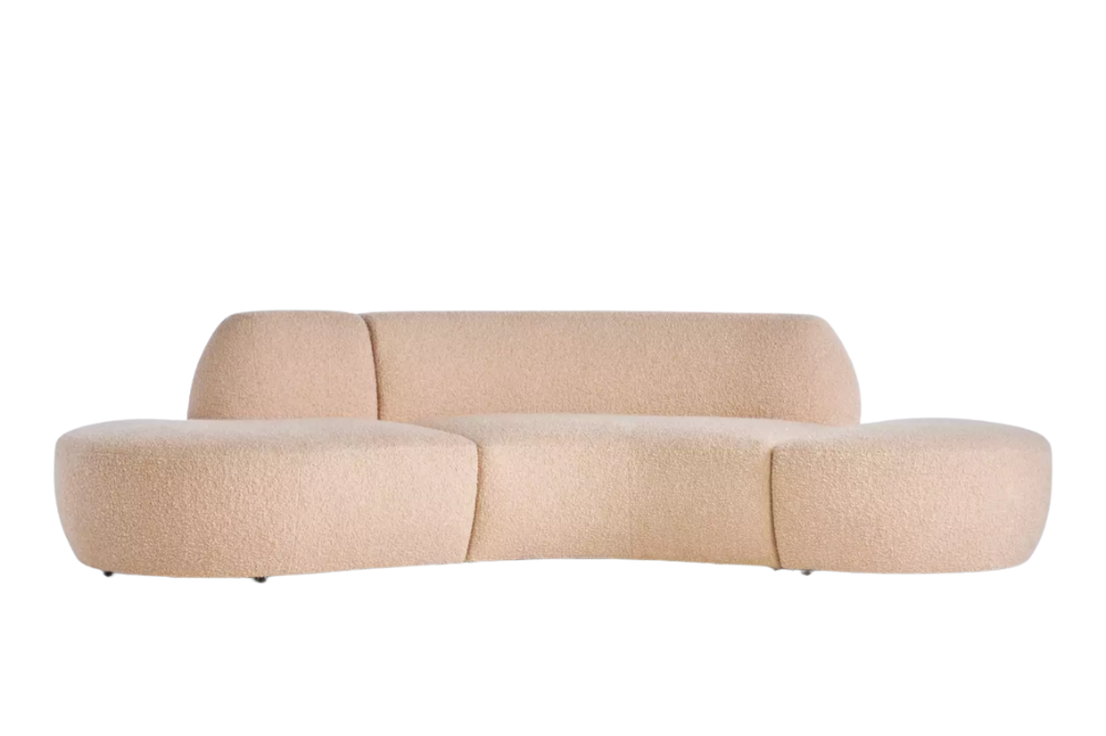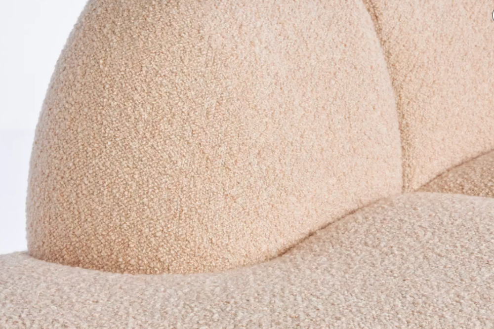 With sculptural curves and a graceful silhouette, this luxe piece pays homage to Vladimir Kagan’s iconic design. Upholstered in soft blush bouclé, it’s as inviting as it is elegant.