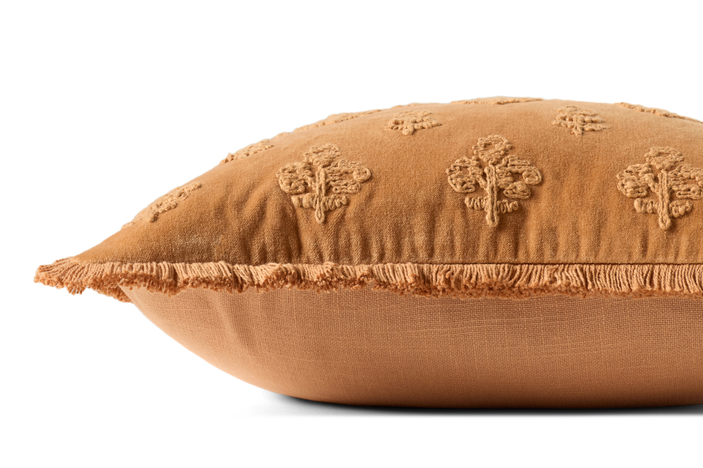 Soft sable velvet pillow adorned with monochromatic embroidered blooms and delicate fringe detailing.