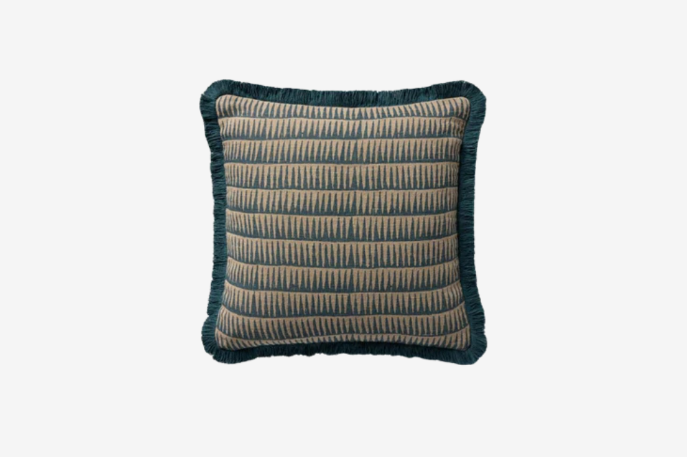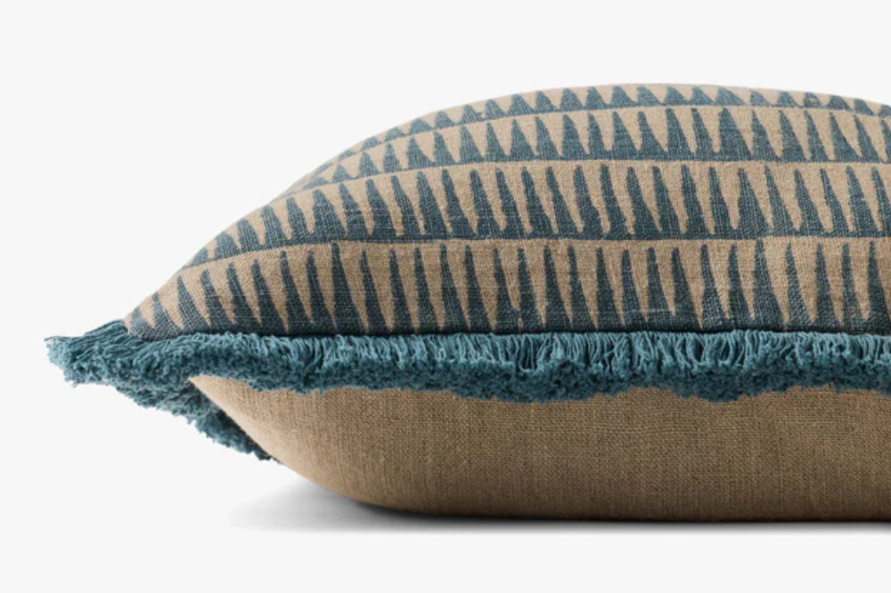 Fringe meets pattern in this bold pillow, where organic, deep blue, and taupe zig-zags ripple across a soft, natural base.