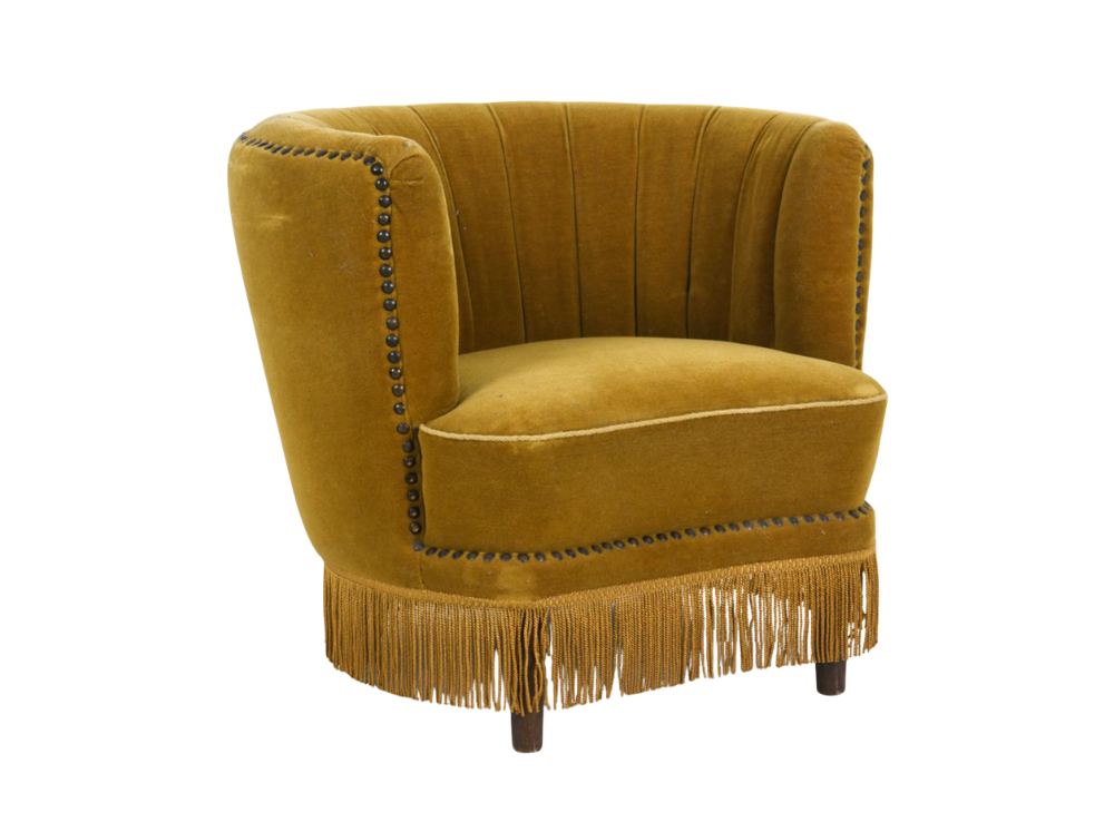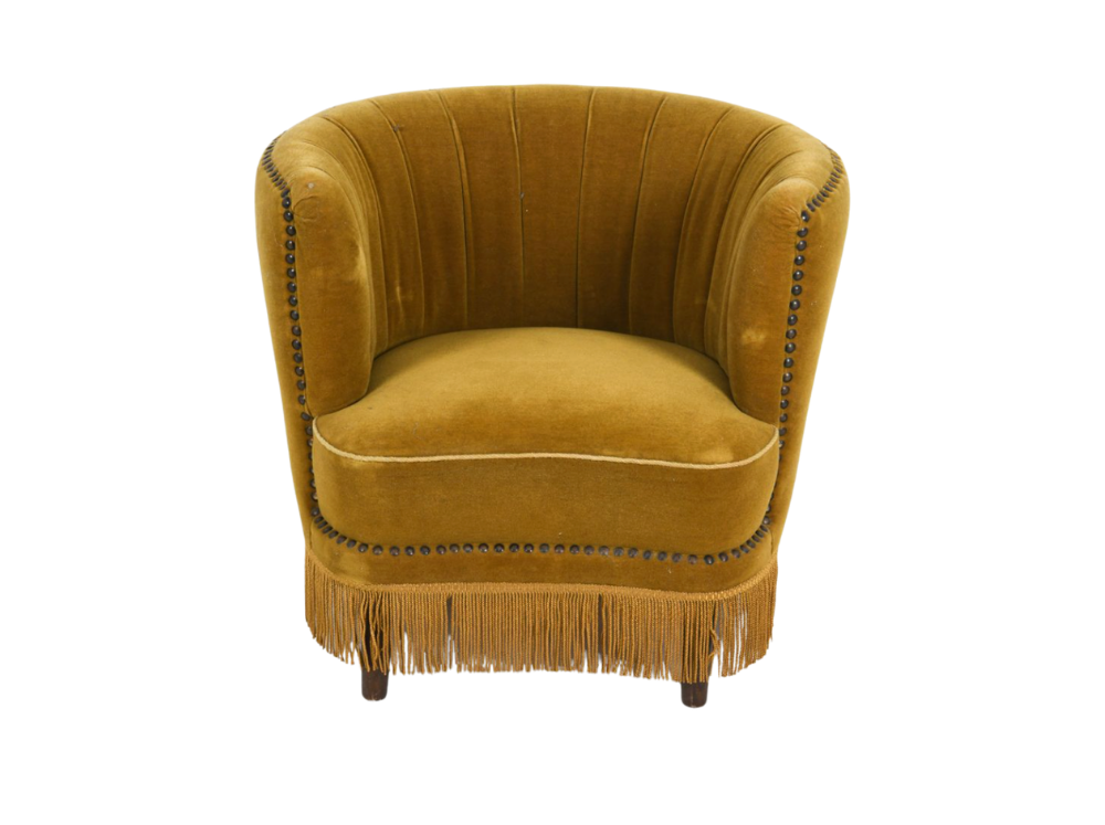 Channeled velvet cocktail chair in the style of Viggo Boesen, featuring original golden velvet upholstery, corded fringe skirt, and oak legs.