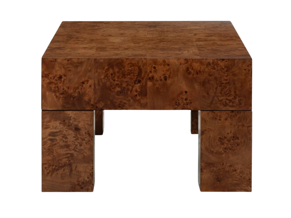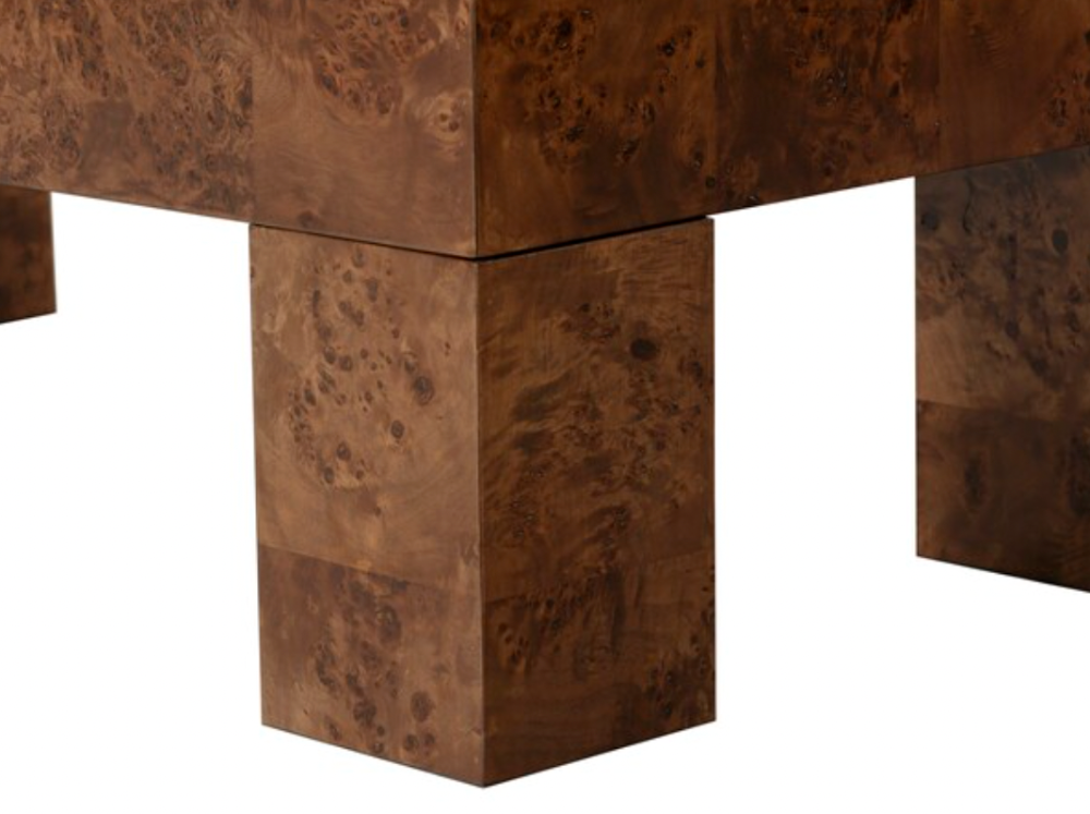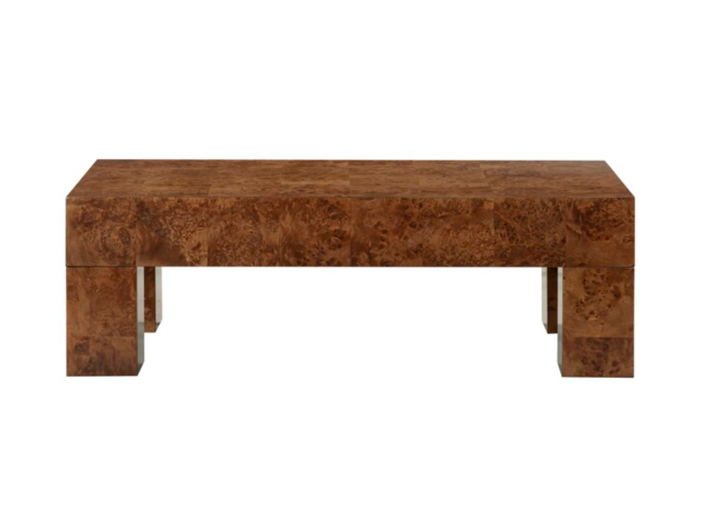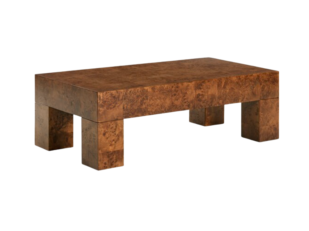 Warm, dappled walnut burl coffee table in a clean-lined Parsons silhouette.