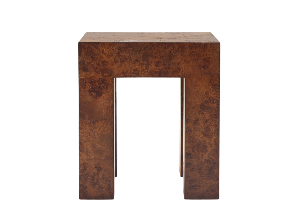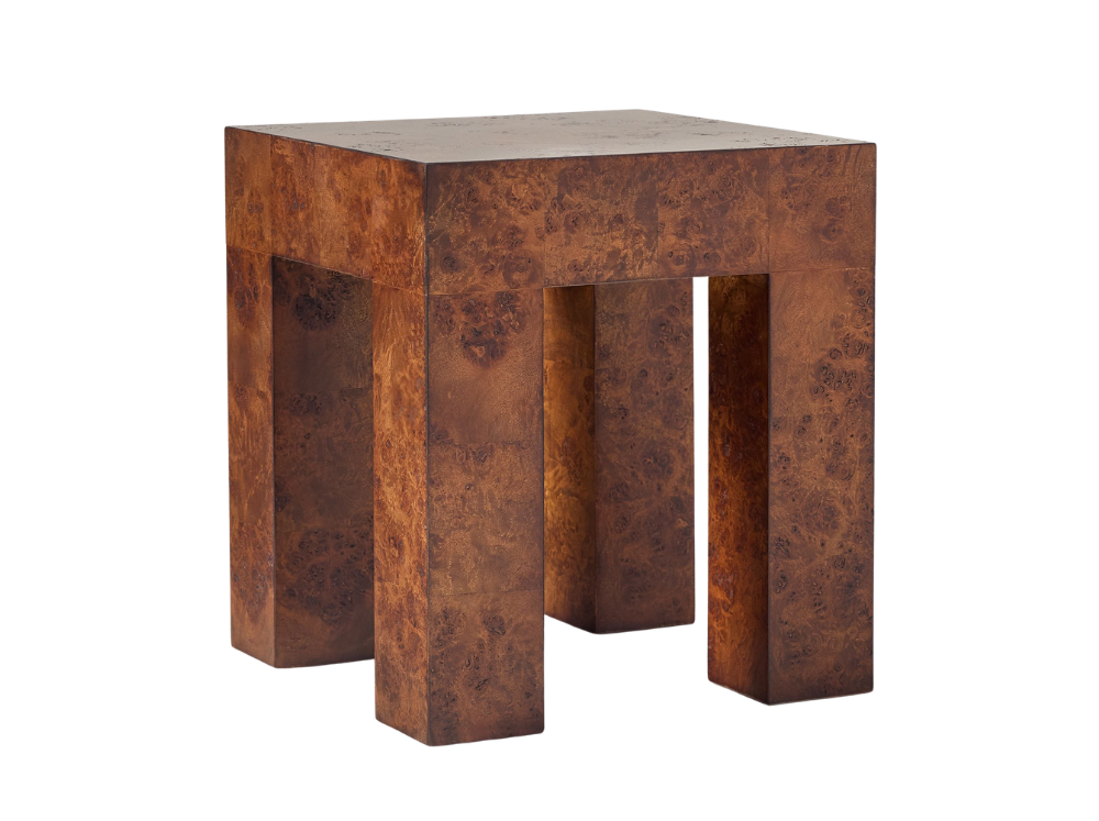 Warm, dappled walnut burl side table in a clean-lined Parsons silhouette.
