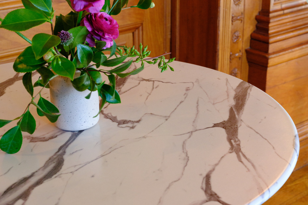 An instant classic—black tulip base with a 36″ white faux Carrara marble top. The perfect cocktail table.